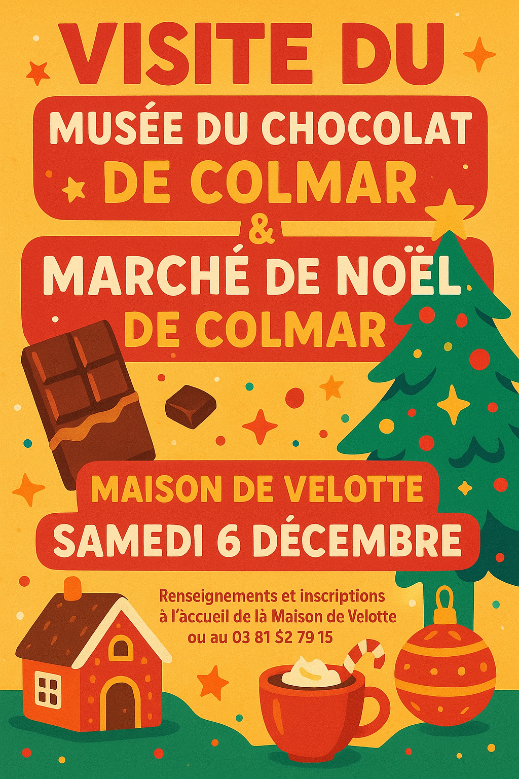 IL NOUS RESTE DES PLACES POUR LA VISITE DU MUSEE DU CHOCOLAT ET DU MARCHE DE NOEL DE COLMAR LE SAMEDI 6 DECEMBRE. N'HESITEZ PLUS A VOUS INSCRIRE ET A EN PARLER AUTOUR DE VOUS !